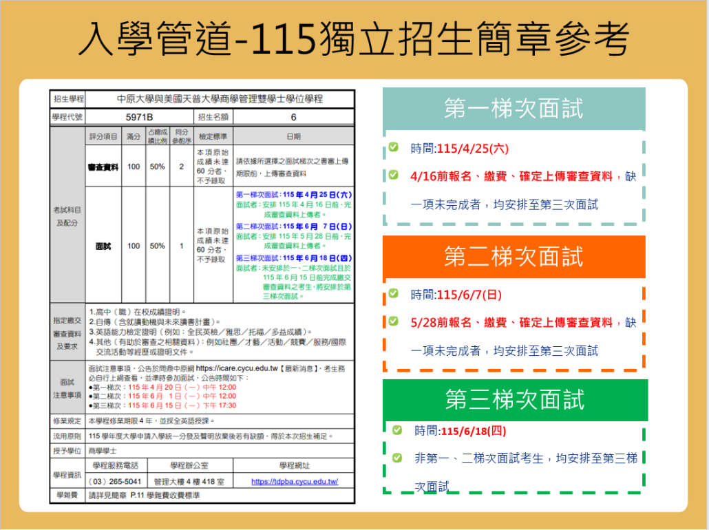 面試梯次安排 於115 年 4 月 16 日前報名、繳費、確認上傳審查資料,將安排於115/4/25(六)面試 於115 年 5 月 28 日前報名、繳費、確認上傳審查資料,將安排於115/6/7(日)面試 未安排於前兩梯次面試者,將統一安排至115/6/18(四)面試